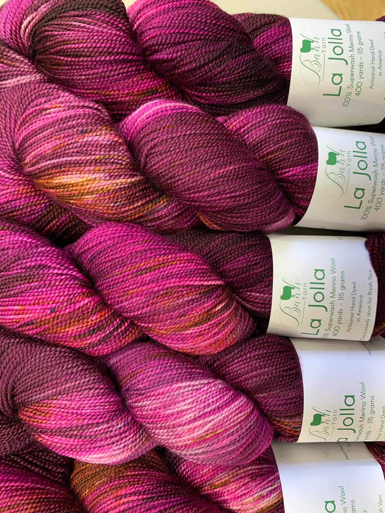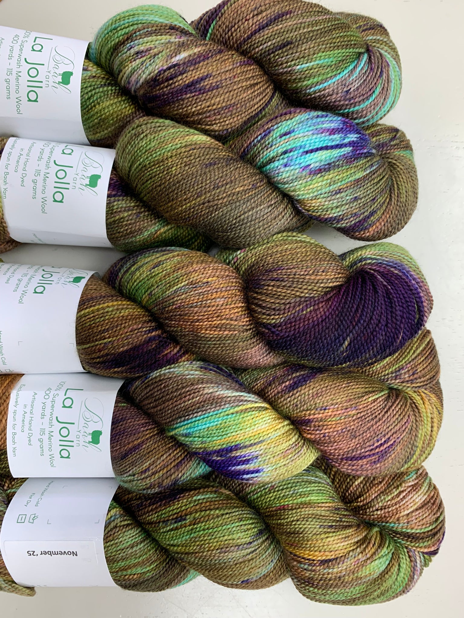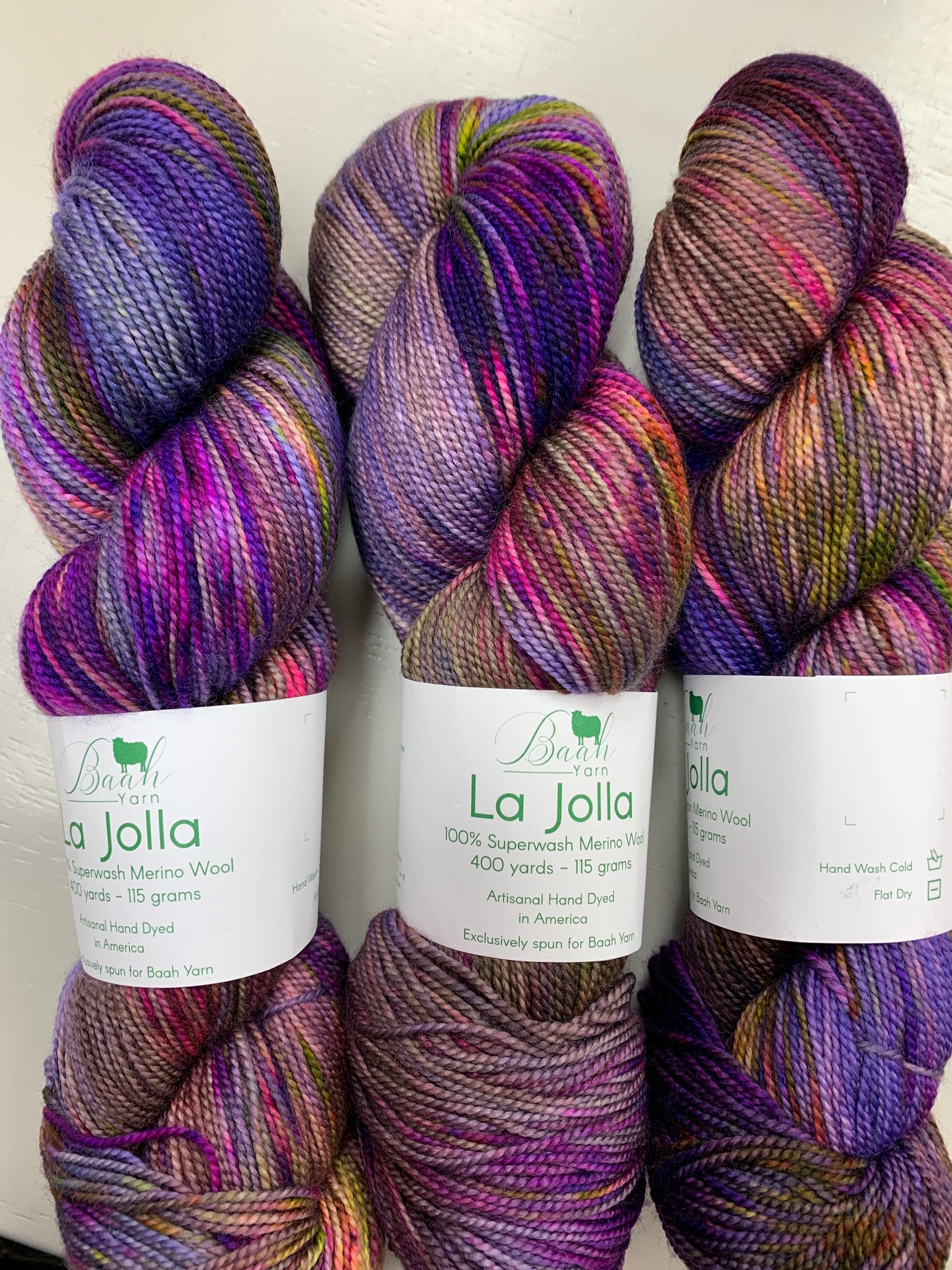 La Jolla, Baah Yarn’s most popular and sought-after product, is a fingering weight yarn, made of 100% superwash merino wool. Each unique skein of Baah Yarn La Jolla is carefully hand painted in small batches in their Las Vegas studio, using only high-quality yarn and professional grade dyes. Please keep in mind that the colors shown on your screen may vary due to differences in computer screen calibration. As with all hand-dyed yarns, each skein takes on a slightly different appearance (even when dyed together!) No two will look identical, which makes each skein unique!